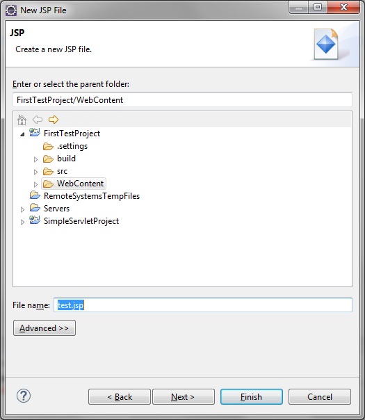 Előbb példányosítottunk egy egy session és context objektumot. Ezután ellenőriztük, hogy van-e tartalma a userName változónak. Ha van elmentünk egy session és egy context változóba is az adatot. Ezután kiíratjuk az értékét.Az eclipse böngészőjében kipróbálhatjuk ezt az url-t: http://localhost:8080/FirstTestProject/NewTestServlet?userName=teszt Ekkor a következőt fogja kiírni: Felhasználó neve: teszt request username: teszt session username: teszt context username: teszt Ebben az esetben mind a 3 változónak van értéke, mert az url-ból kiolvastuk és elmentettük a session és context változóba is. Ha ezután ezt az url-t írjuk be: http://localhost:8080/FirstTestProject/NewTestServlet akkor ez látszódik: Felhasználó neve: null request username: null session username: teszt context username: teszt Ebben az esetben már a sima userName mezőnek nincs értéke, de a session és a context értéke megmaradt. Ezután pedig ha nyitunk egy másik böngészőt mondjuk egy firefox-ot és beírjuk az url-t http://localhost:8080/FirstTestProject/NewTestServlet akkor ez fog látszódni: Felhasználó neve: null request username: null session username: null context username: teszt A másik böngészőben már csak a context értéke maradt meg. Most a jsp fájlokat fogjuk egy kicsit közelebbről megnézni. Végül is a megjelenítésért felelős, egyszerűsítsük így le a dolgot. A jsp fájlokban keveredhet a html és a java kód. Azt érdemes lehet tudni, hogy a jsp fájlok servlet fájlokká fordulnak le a háttérben. Készítsünk egy test.jsp fájl a webcontent mappába. Webcontent mappán jobb klikk->new->other->JSP file. ![]() A fájl tartama legyen a következő: